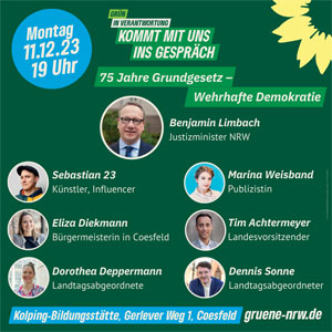 11.12.2023: Im Rahmen einer Veranstaltungsreihe 'Grün in Verantwortung' des Landesverbandes und auf Einladung von Dennis Sonne und Dorothea Deppermann (MdL) waren Benjamin Limbach, Marina Weisband, Sebastian 23, Eliza Diekmann und Tim Achtermeyer zu Gast in der Kolping-Bildungsstätte Coesfeld.